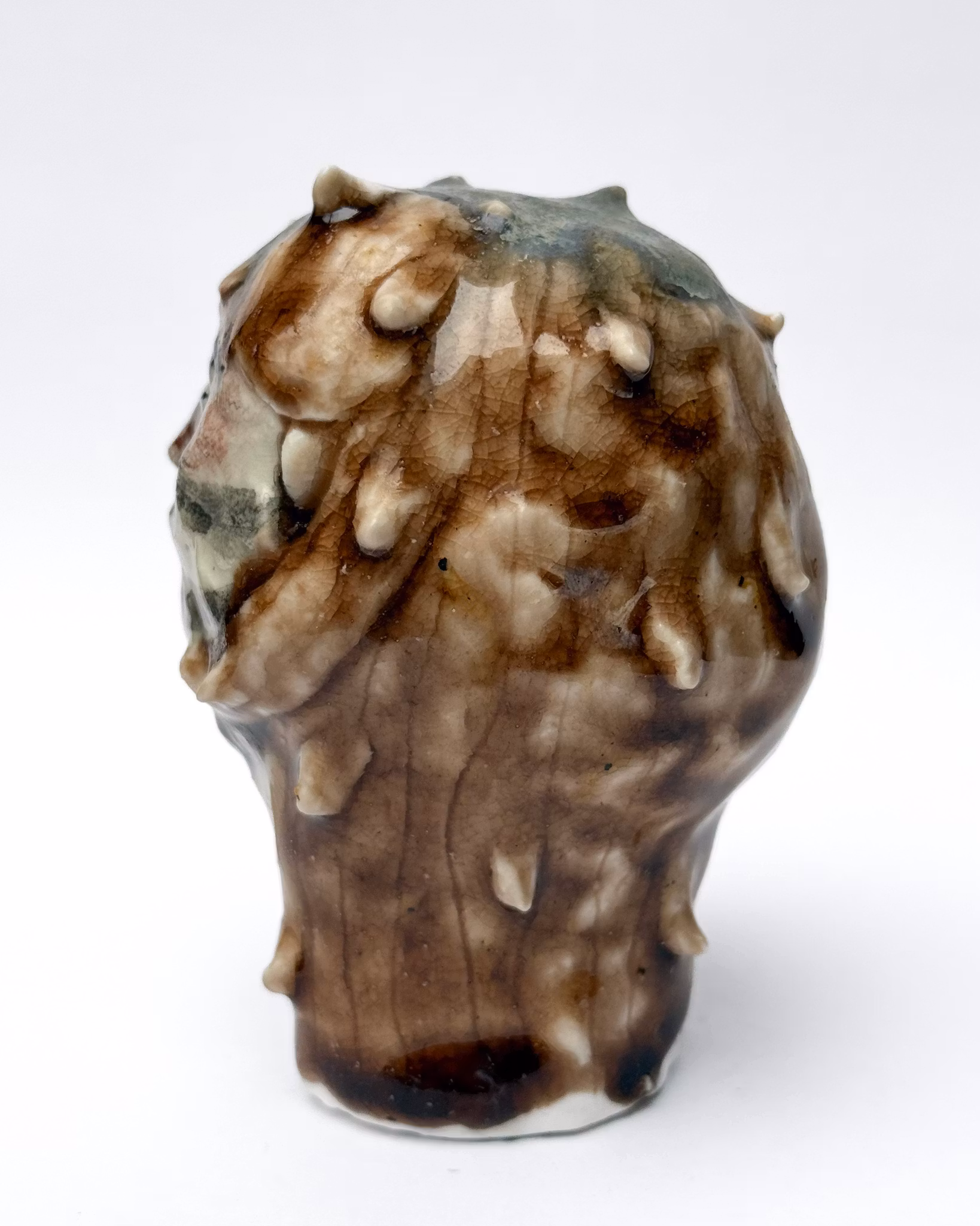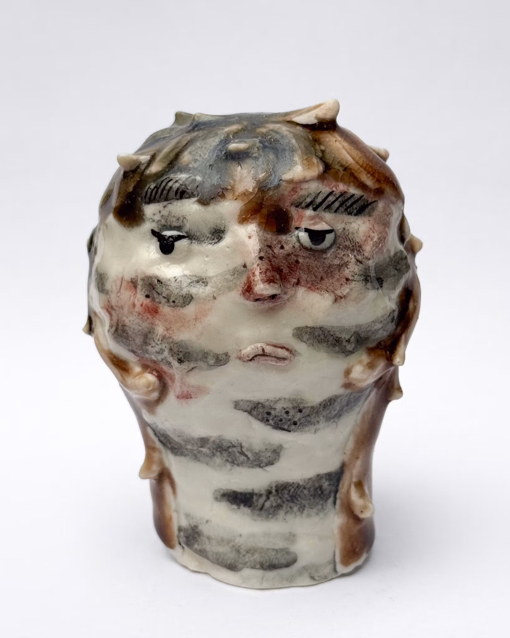 Den lilla varelsen GRENTORKA är skulpterad i stengodslera och glasyr, vars glasyrer blandas för hand i verkstan och målas varsamt med en kinesisk dekorpensel. Alla varelser härstammar från Vråskogen i Örby och väcks till liv under ugnens sista bränning – en nattlig ritual som förvandlar kropp till levande väsen.