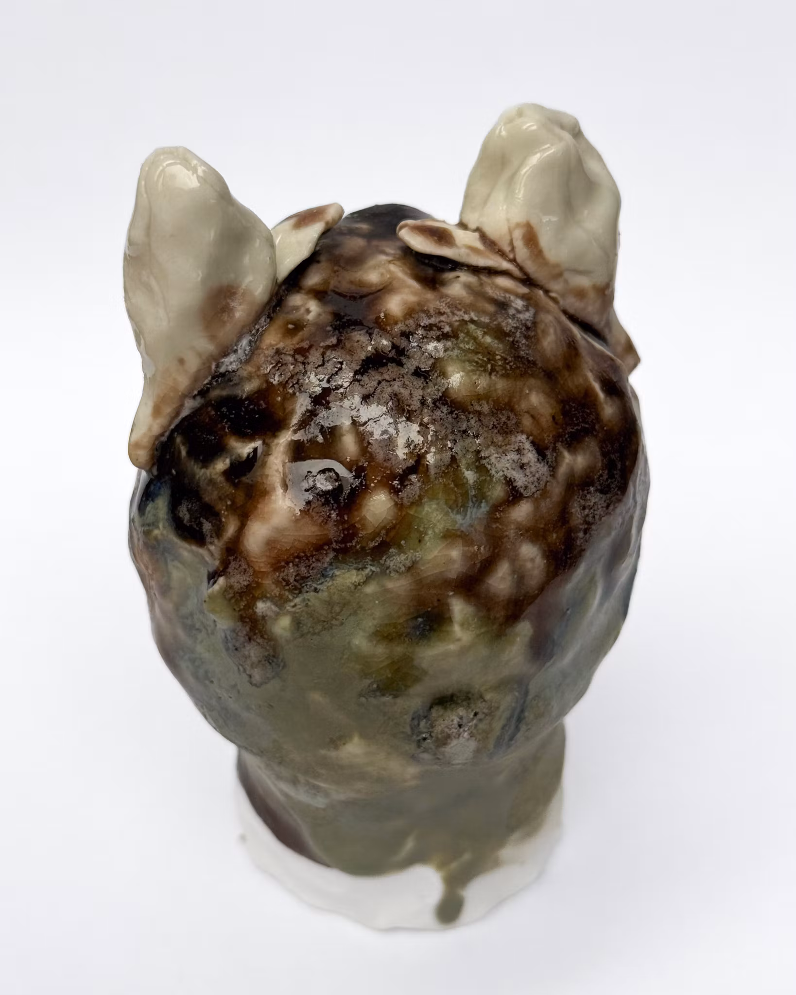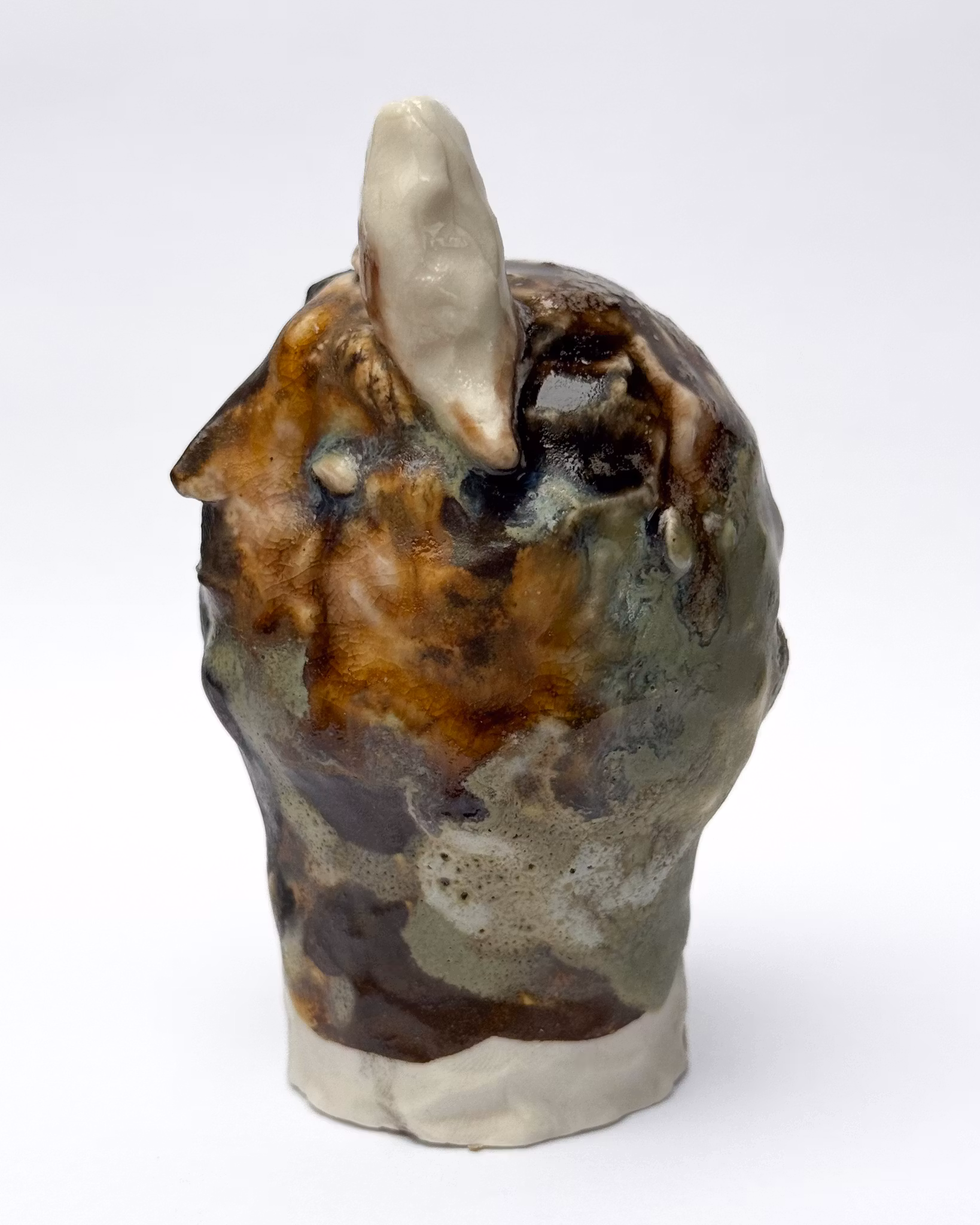 Den lilla varelsen HORNROS är skulpterad i stengodslera och glasyr, vars glasyrer blandas för hand i verkstan och målas varsamt med en kinesisk dekorpensel. Alla varelser härstammar från Vråskogen i Örby och väcks till liv under ugnens sista bränning – en nattlig ritual som förvandlar kropp till levande väsen.