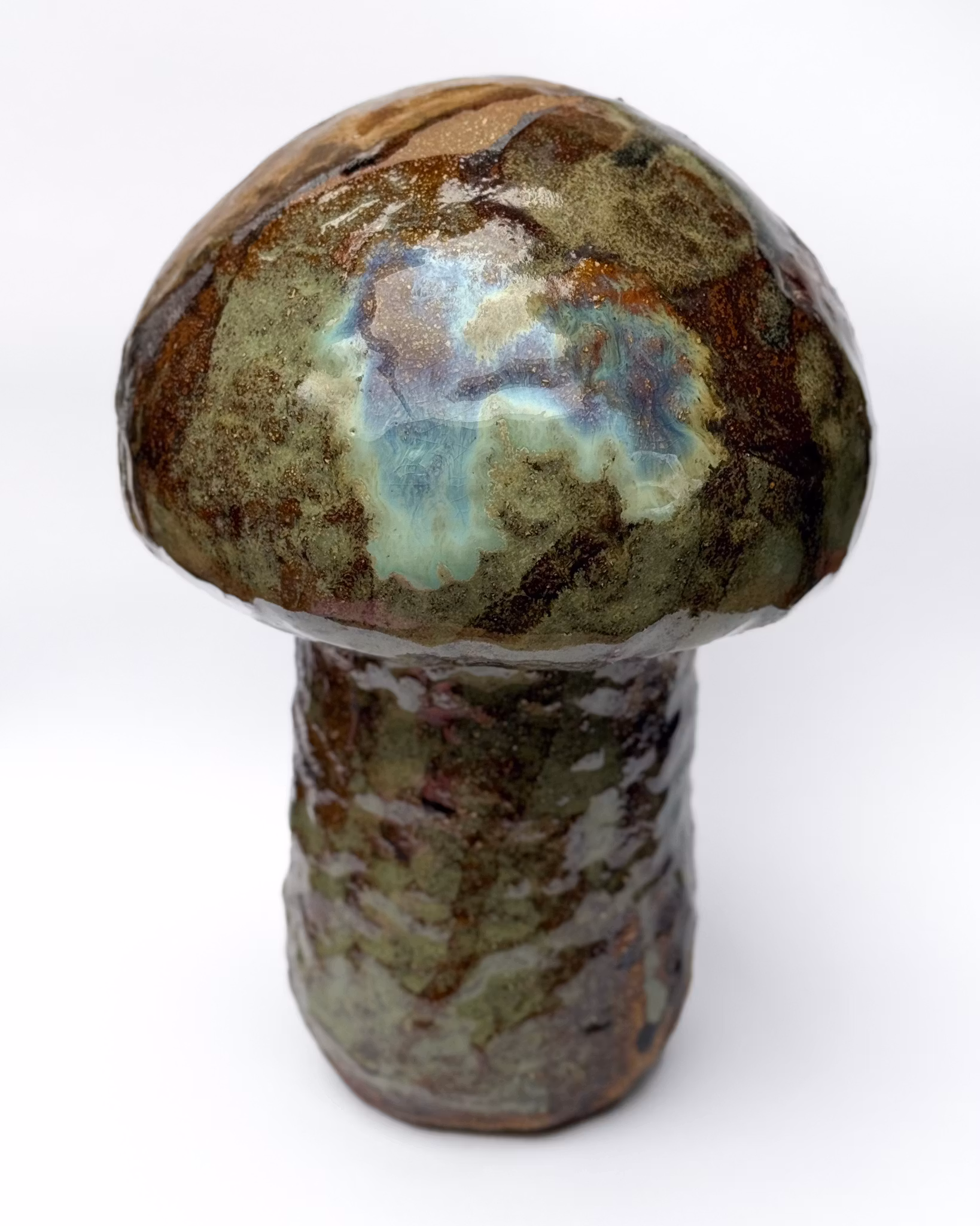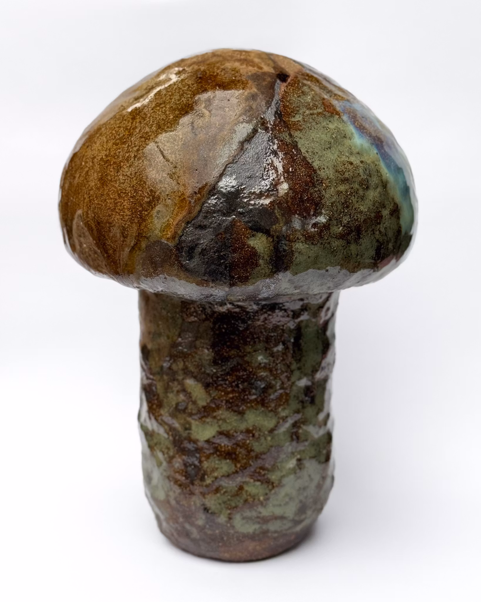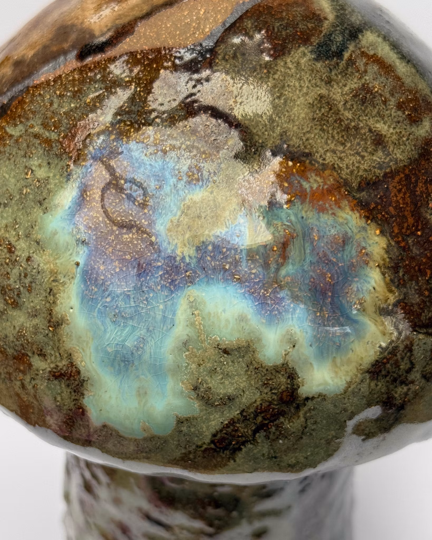Den lilla varelsen JORDSKEN är skulpterad i porslinslera och glasyr, vars glasyrer blandas för hand i verkstan och målas varsamt med en kinesisk dekorpensel. Alla varelser härstammar från Vråskogen i Örby och väcks till liv under ugnens sista bränning – en nattlig ritual som förvandlar kropp till levande väsen.