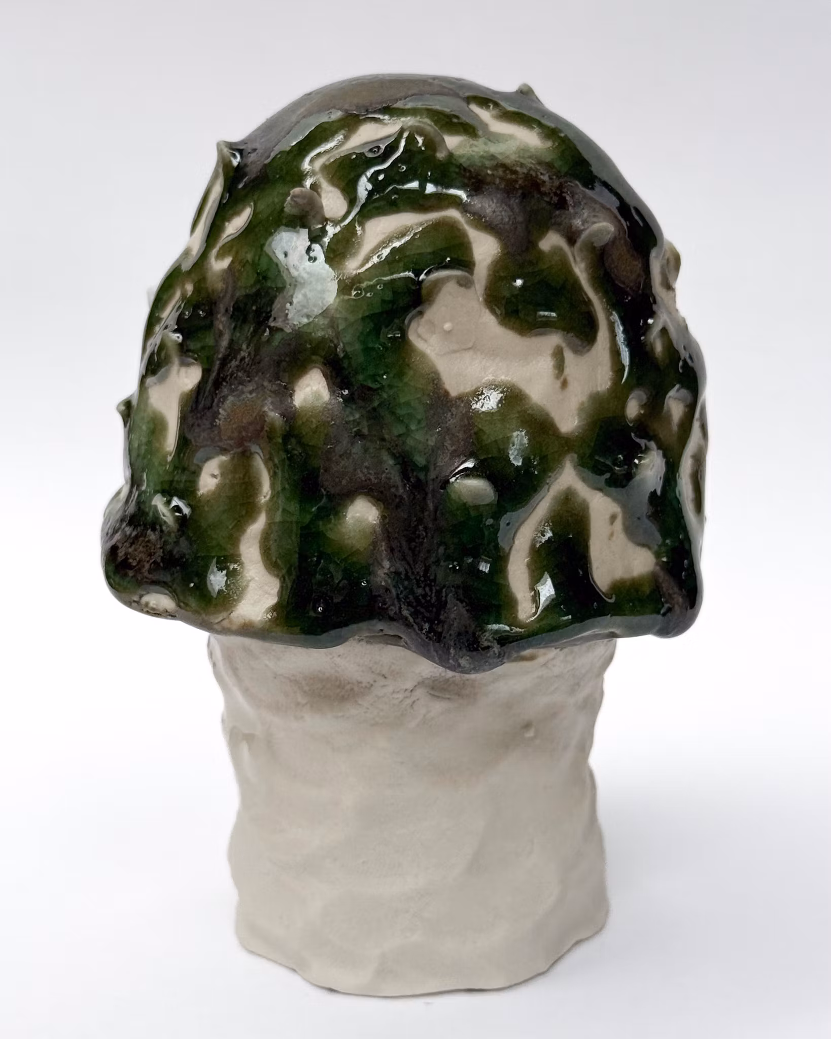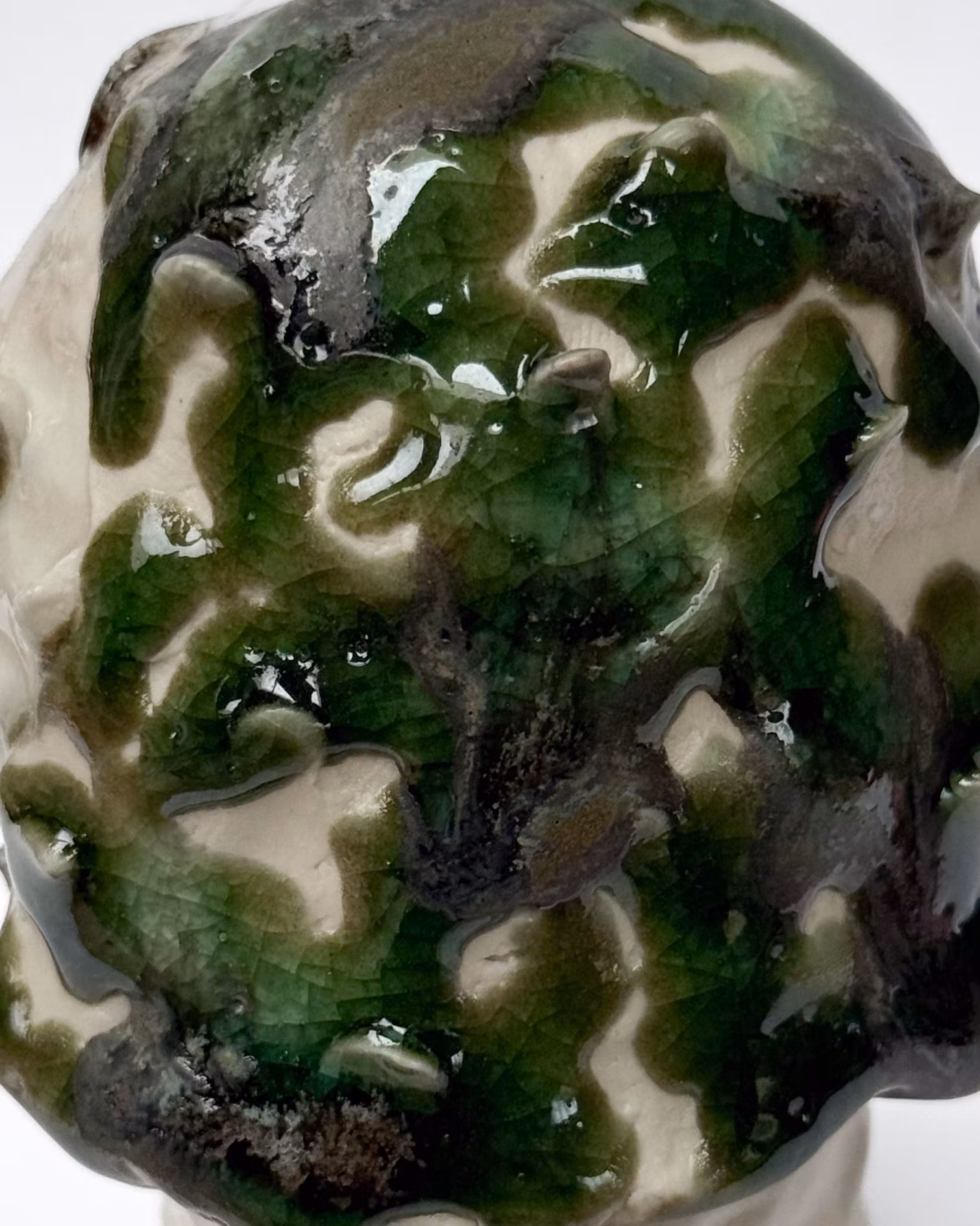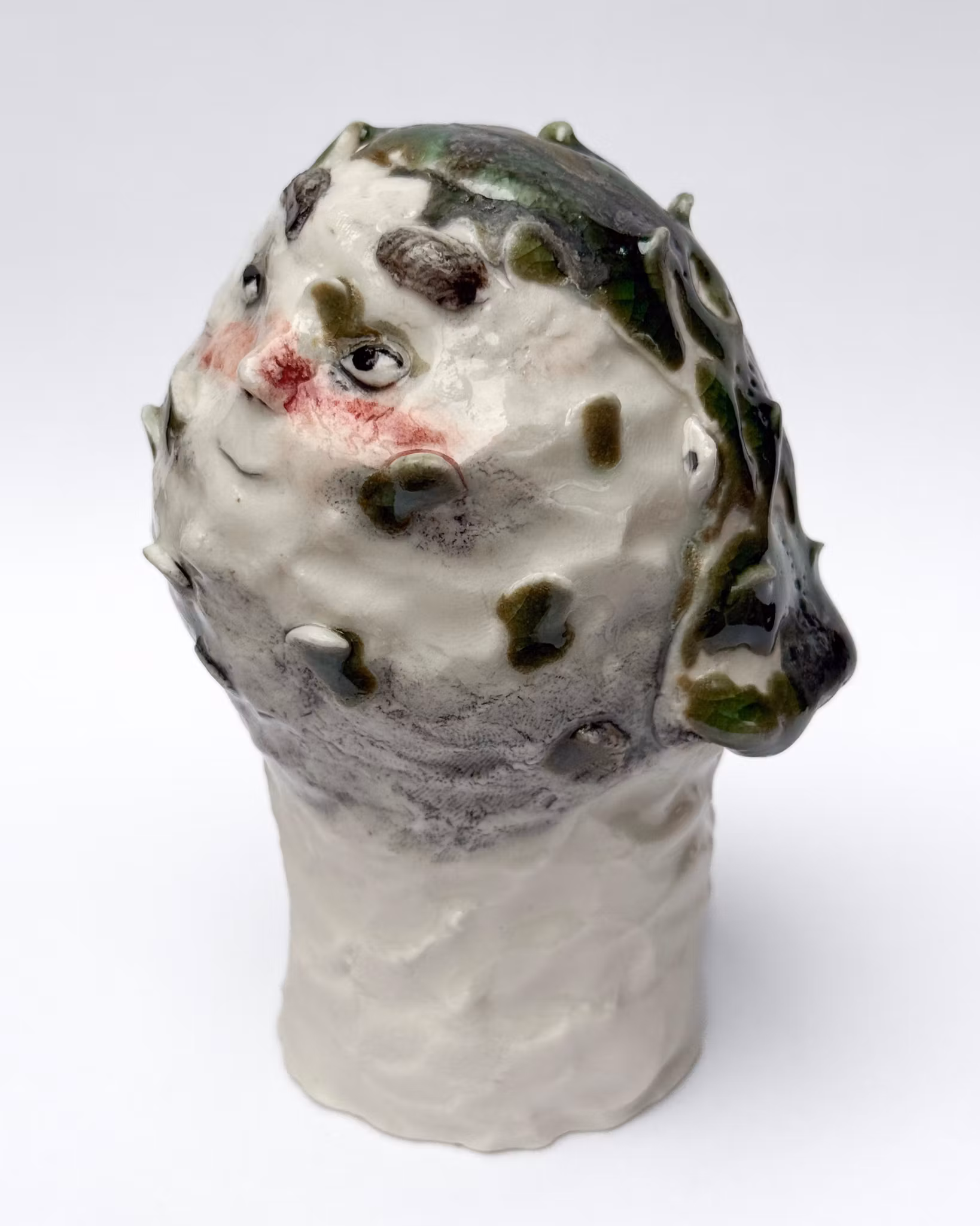 Den lilla varelsen LÖV-BÖS är skulpterad i stengodslera och glasyr, vars glasyrer blandas för hand i verkstan och målas varsamt med en kinesisk dekorpensel. Alla varelser härstammar från Vråskogen i Örby och väcks till liv under ugnens sista bränning – en nattlig ritual som förvandlar kropp till levande väsen.