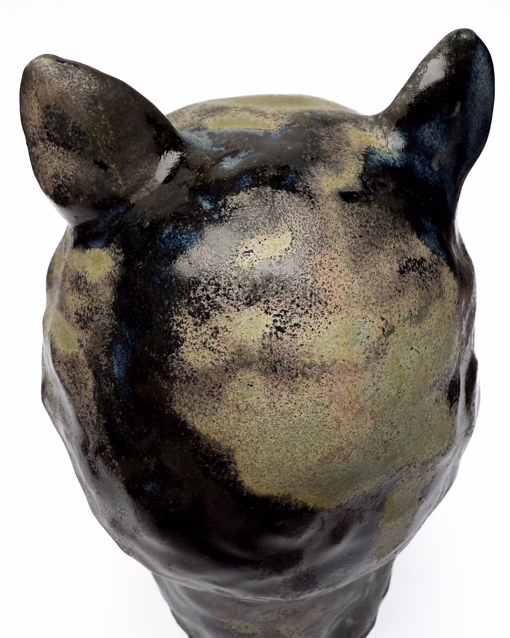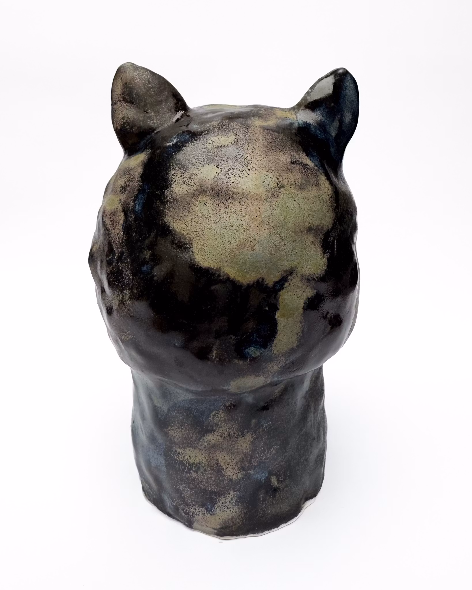 Den lilla varelsen SKOGSKATT är skulpterad i porslinslera och glasyr, vars glasyrer blandas för hand i verkstan och målas varsamt med en kinesisk dekorpensel. Alla varelser härstammar från Vråskogen i Örby och väcks till liv under ugnens sista bränning – en nattlig ritual som förvandlar kropp till levande väsen.