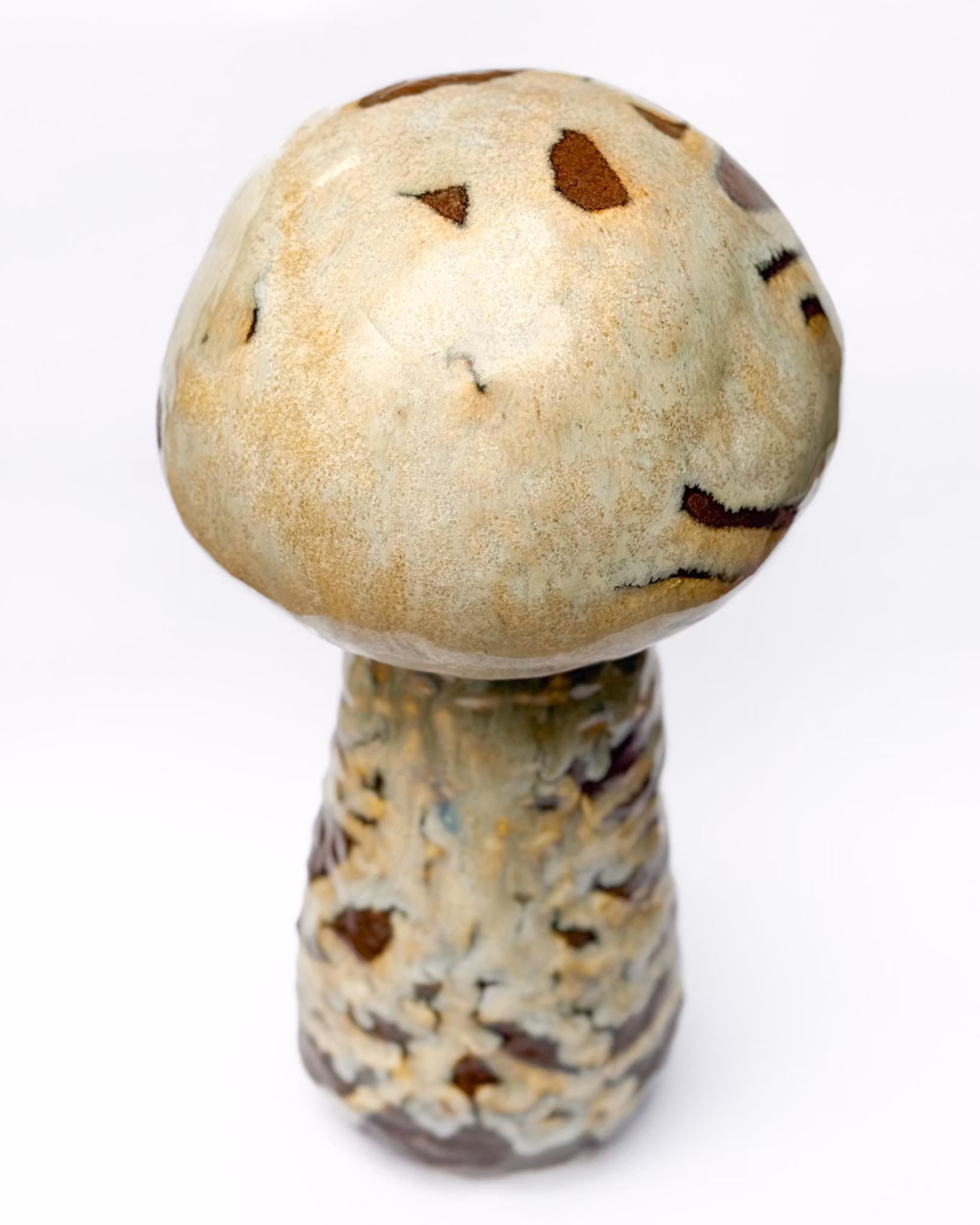 Den lilla varelsen STJÄRNFALL är skulpterad i porslinslera och glasyr, vars glasyrer blandas för hand i verkstan och målas varsamt med en kinesisk dekorpensel. Alla varelser härstammar från Vråskogen i Örby och väcks till liv under ugnens sista bränning – en nattlig ritual som förvandlar kropp till levande väsen.