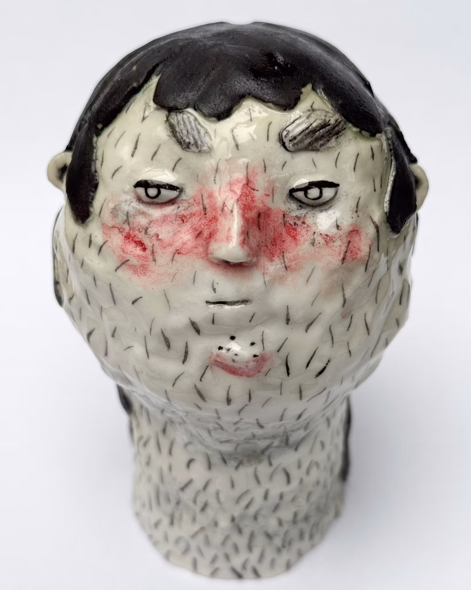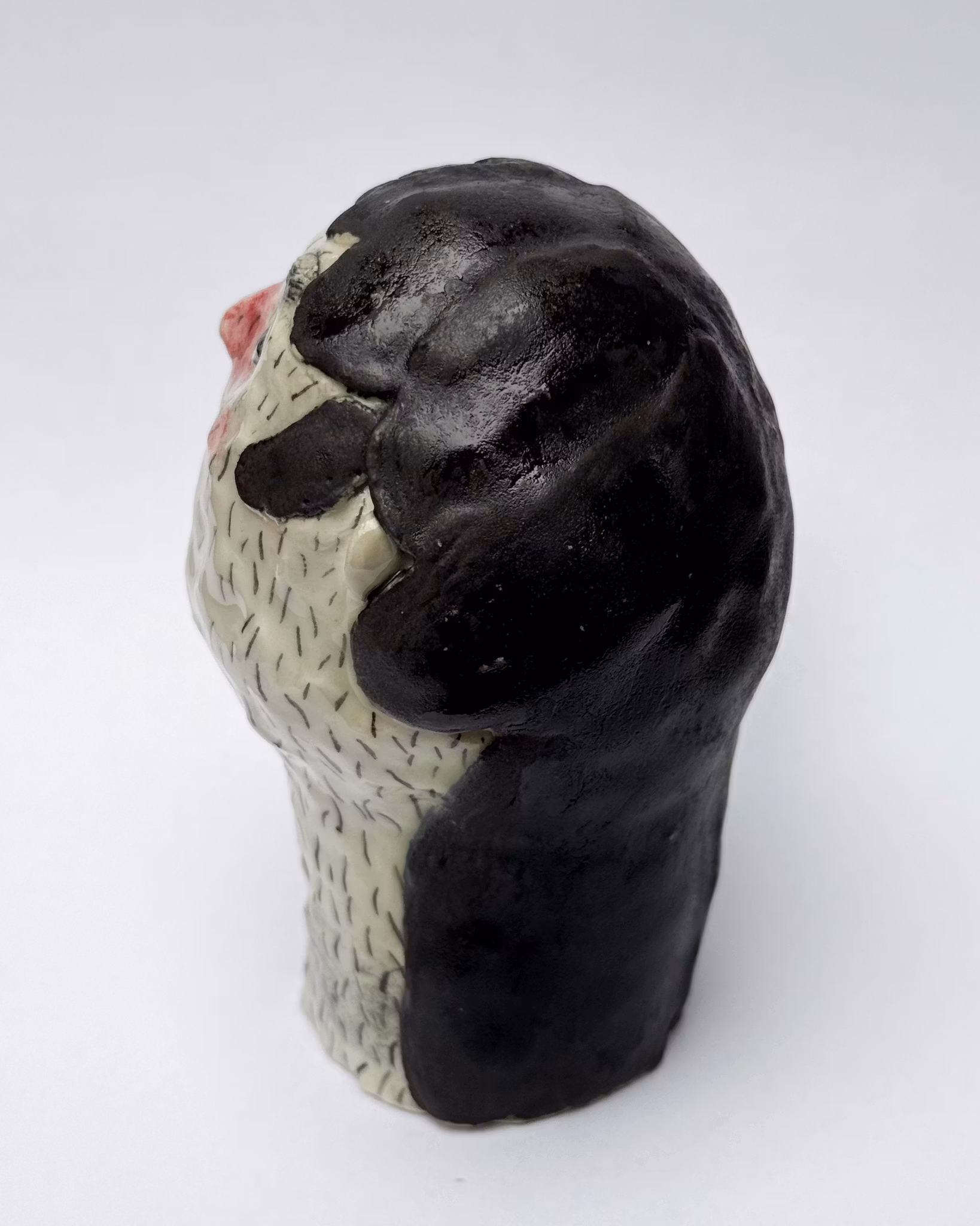 Den lilla varelsen VARGMAMMA är skulpterad i porslinslera och glasyr, vars glasyrer blandas för hand i verkstan och målas varsamt med en kinesisk dekorpensel. Alla varelser härstammar från Vråskogen i Örby och väcks till liv under ugnens sista bränning – en nattlig ritual som förvandlar kropp till levande väsen.