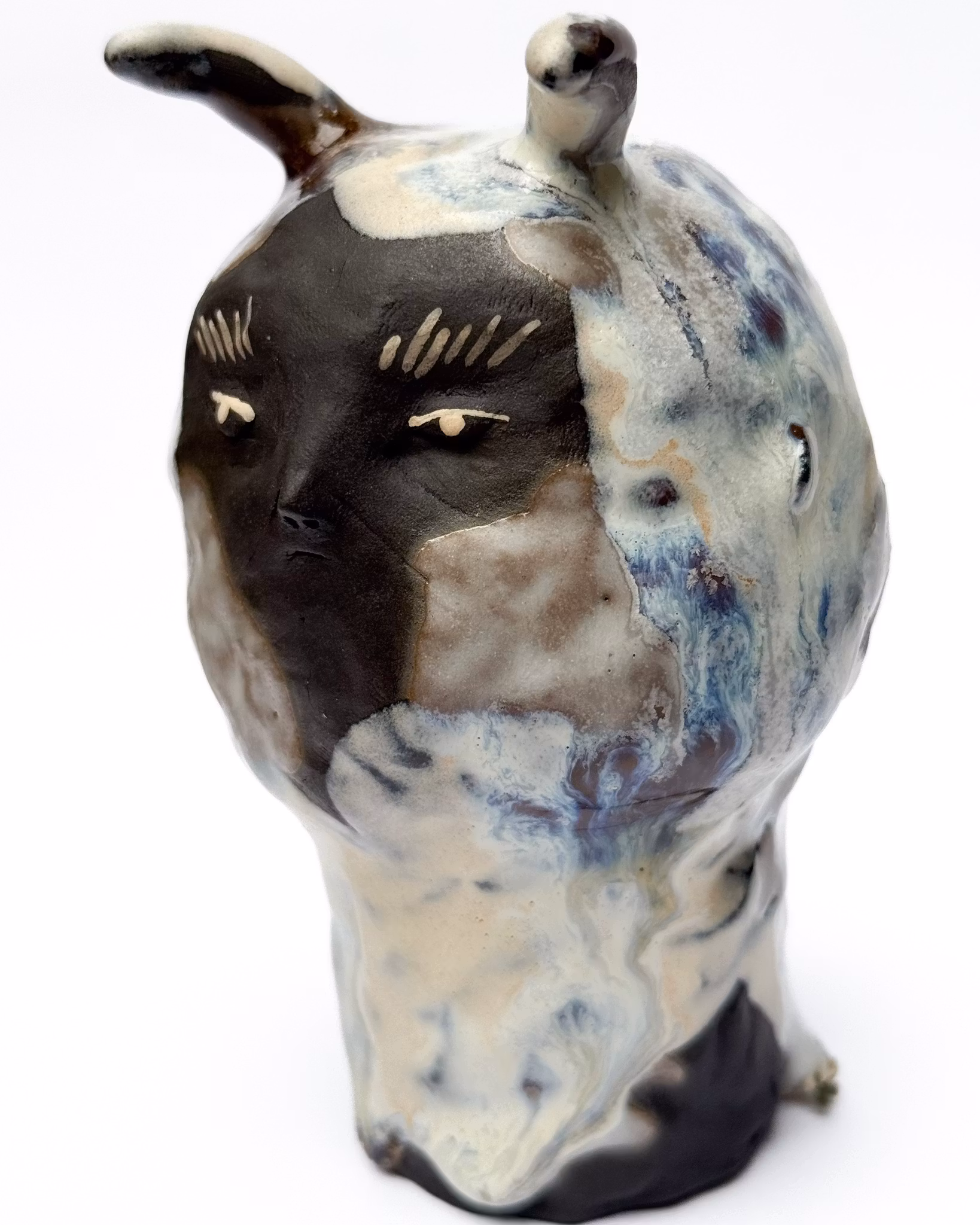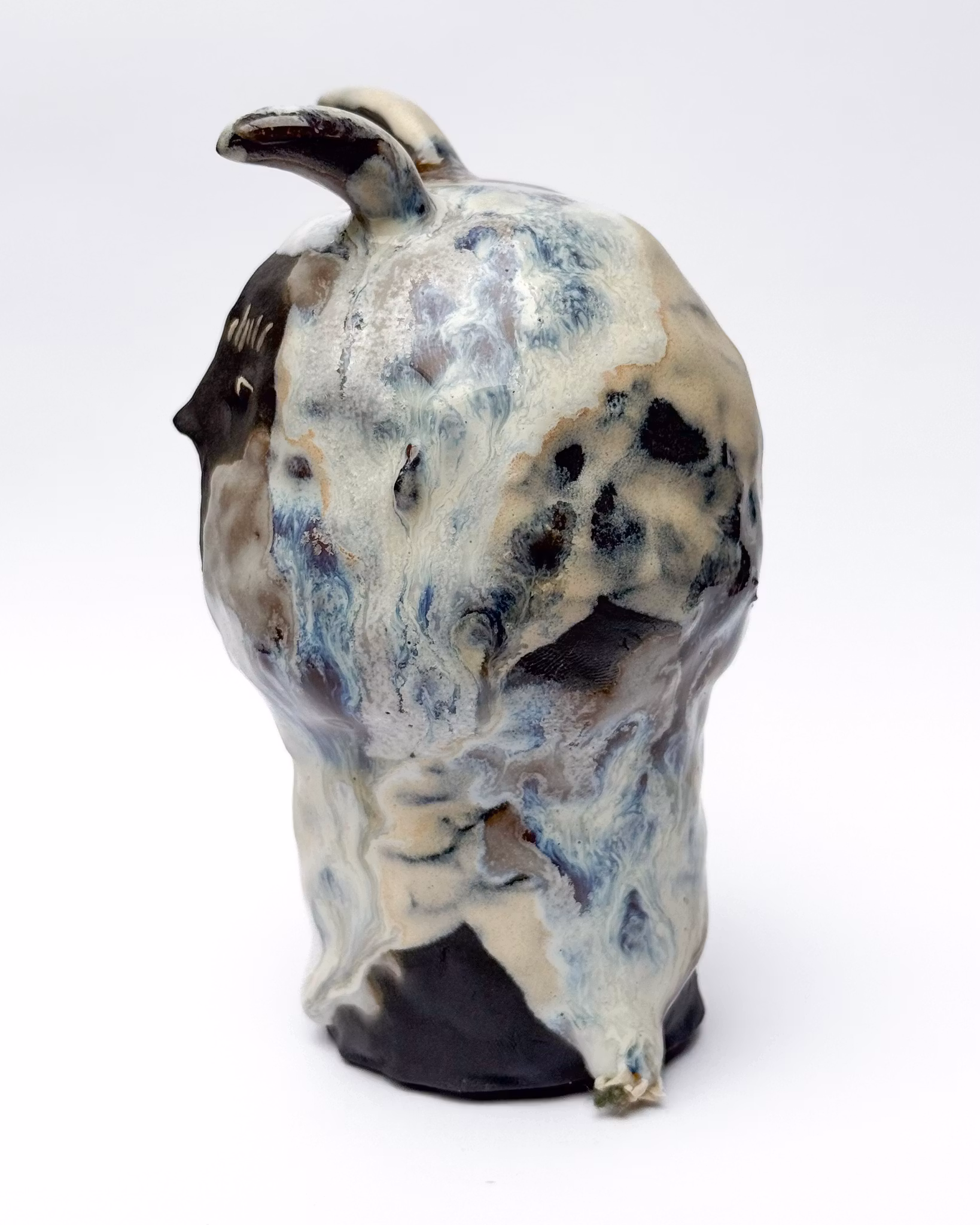 Den lilla varelsen VRÅFLUX är skulpterad i porslinslera och glasyr, vars glasyrer blandas för hand i verkstan och målas varsamt med en kinesisk dekorpensel. Alla varelser härstammar från Vråskogen i Örby och väcks till liv under ugnens sista bränning – en nattlig ritual som förvandlar kropp till levande väsen.